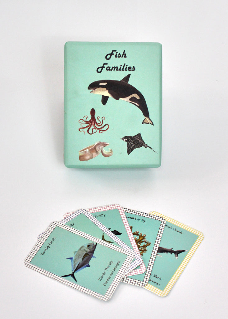 Fish Families Playing Card Box is a compact and colorful set of playing cards that features various types of fish, making it a fun and educational game for all ages.